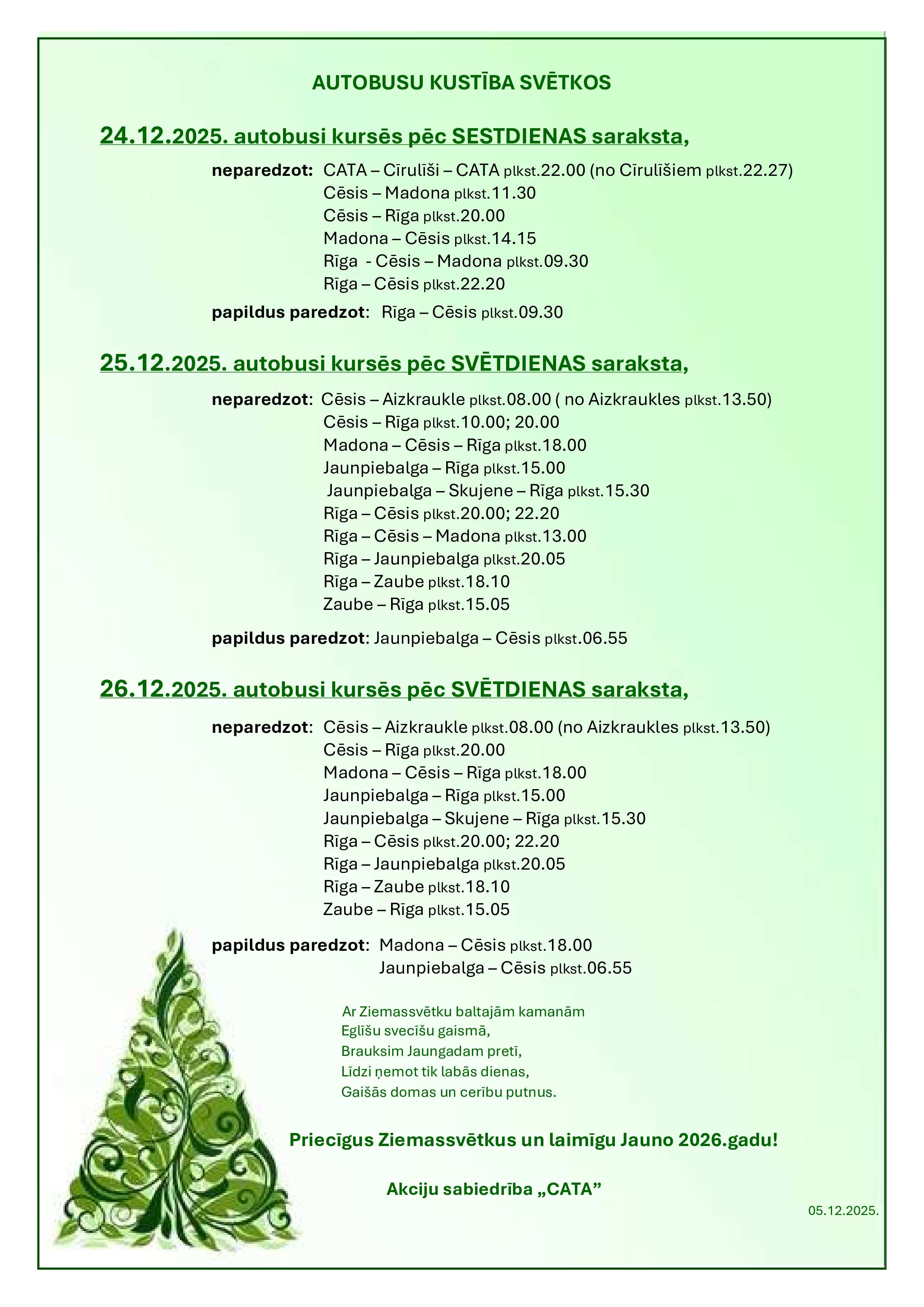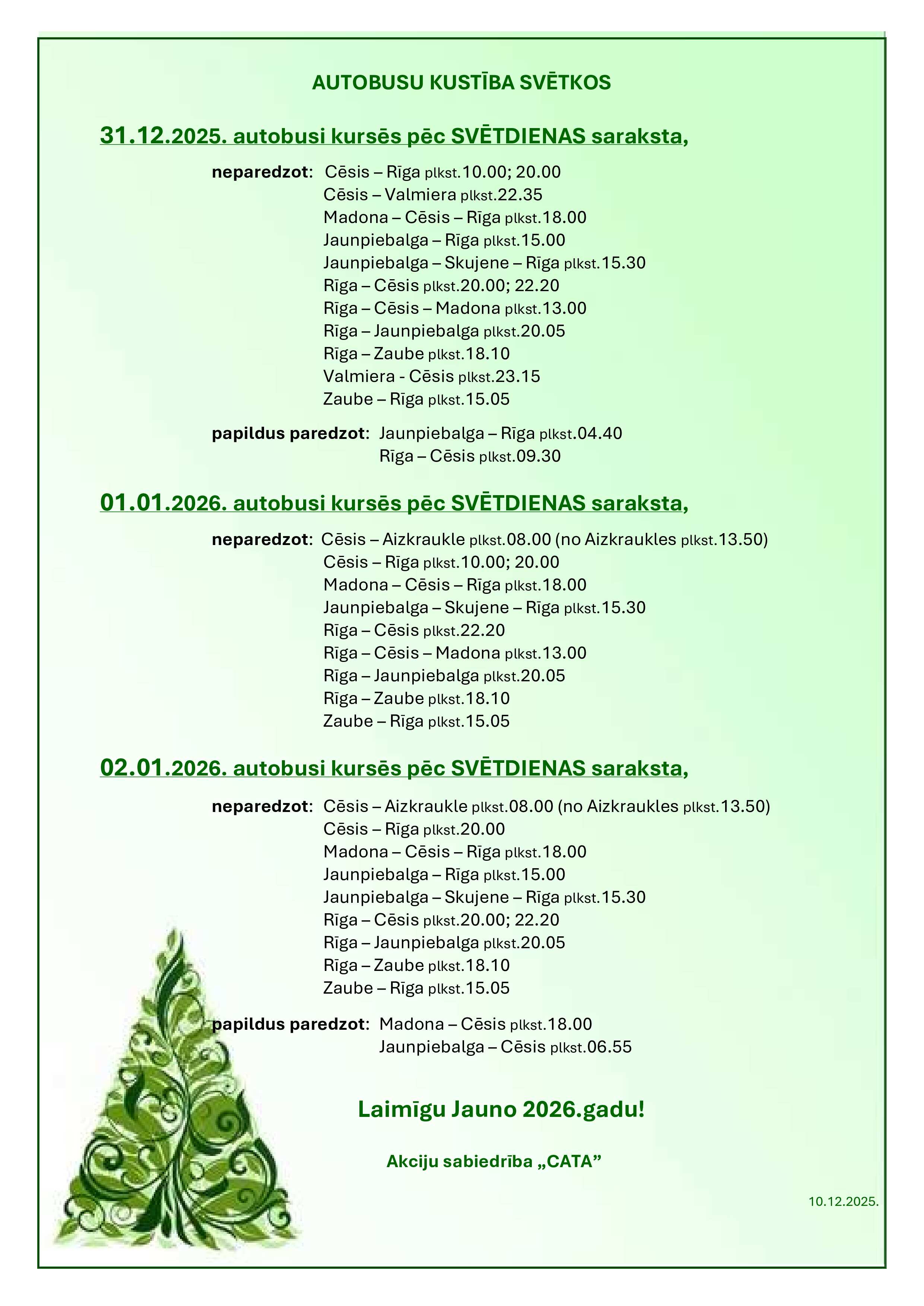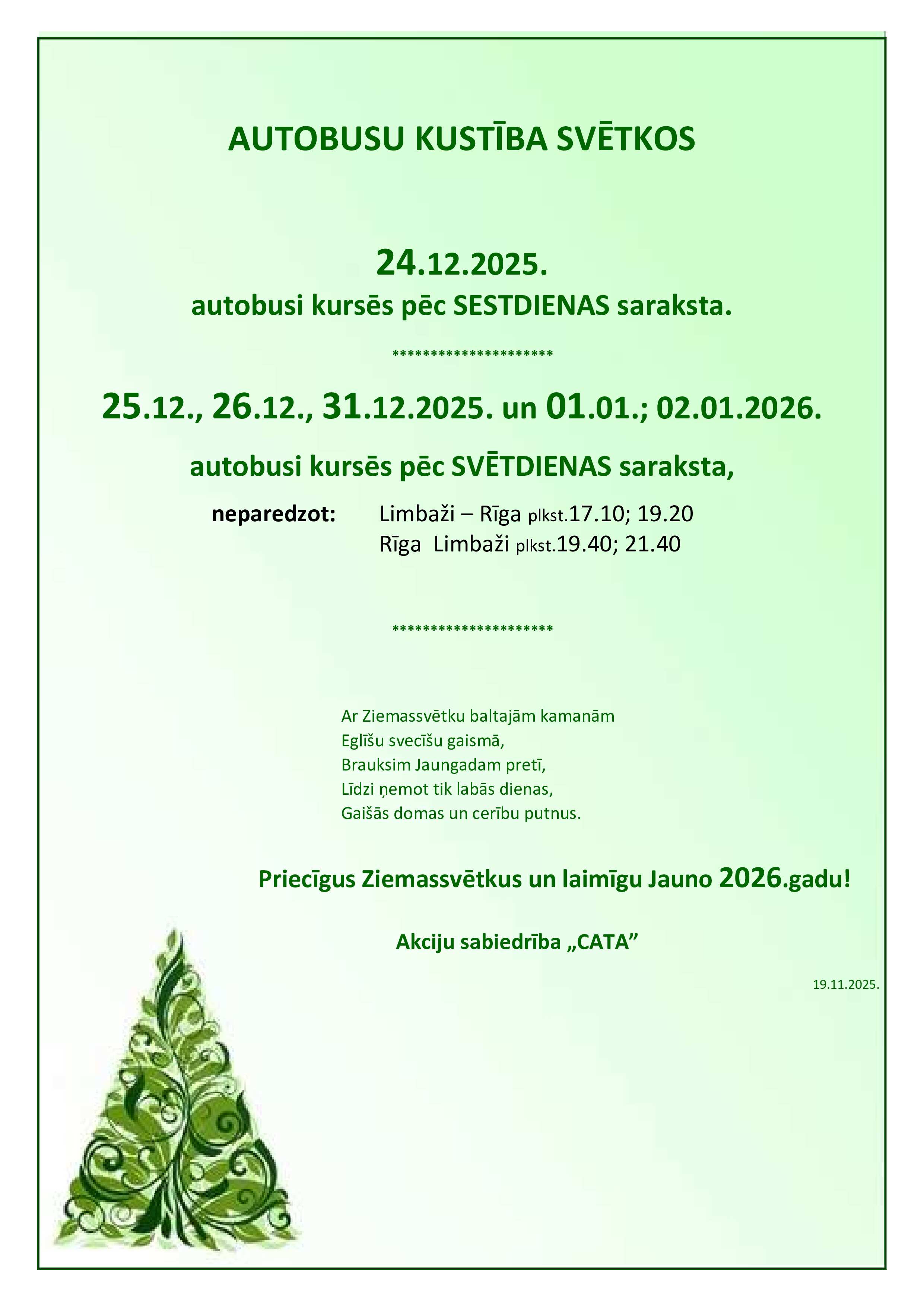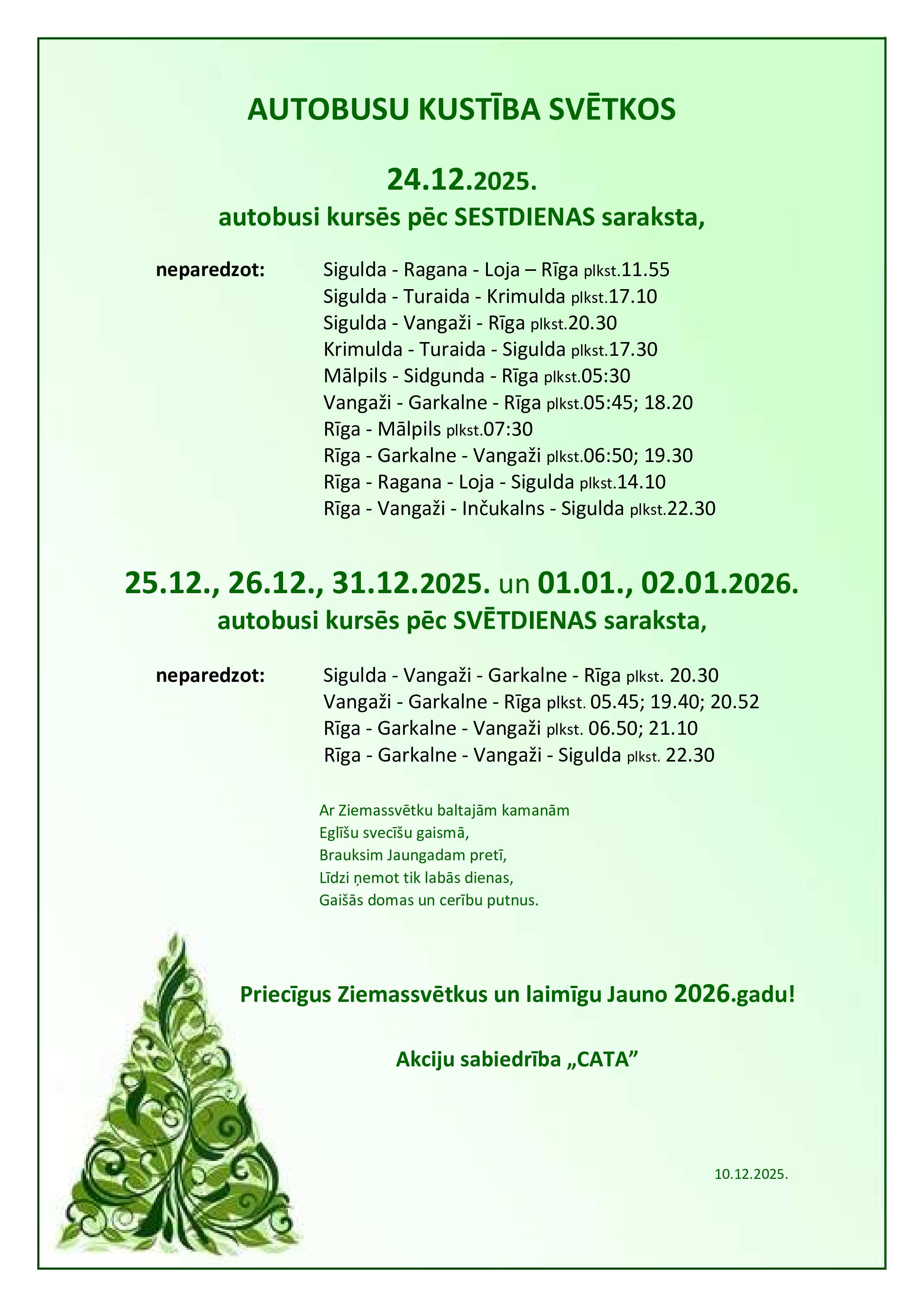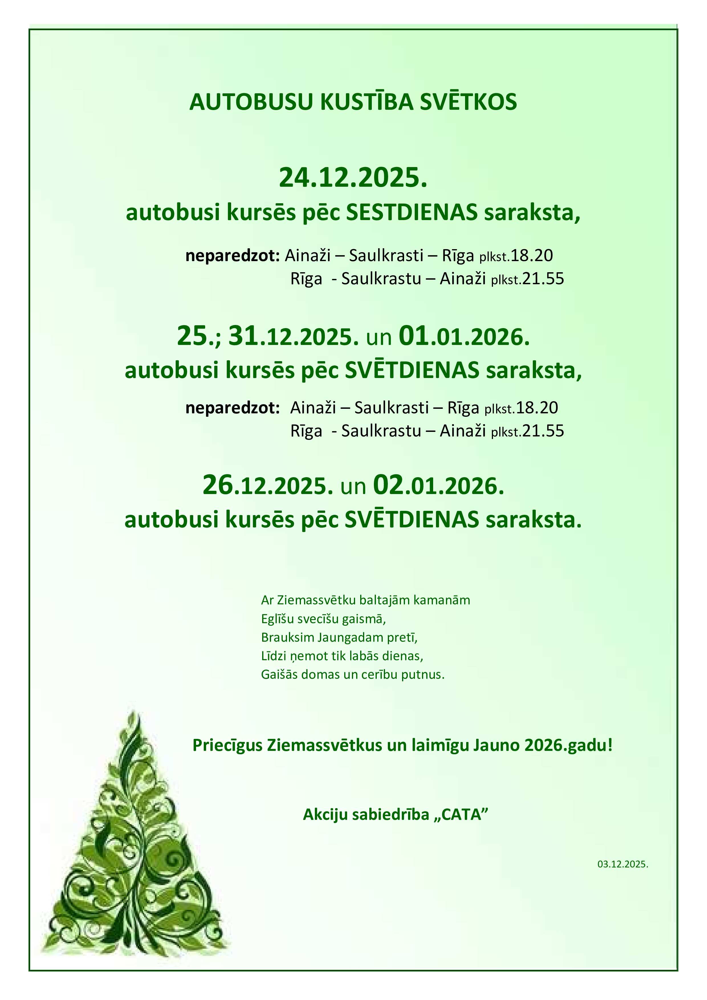 Autobusu kustības izmaiņas Ziemassvētkos un Jaunā gada svētkos -